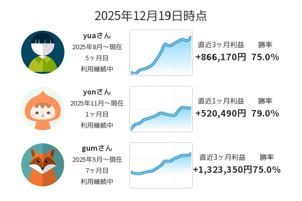 ※利益:実際にユーザーがロボトレーダーから受け取った売買シグナルを元に計算した利益額になります。利益、収益等金額については取引手数料・税金等は考慮しておりません。日々ストラテジーから配信される売買シグナルでは、新規エントリー(買い/売り)、銘柄、数量、そして決済についても明確に記載があります。また注文方法も寄付成行の為、売買シグナルを受け取ったユーザー全員が同じ取引、同じ約定価格を実現できます。